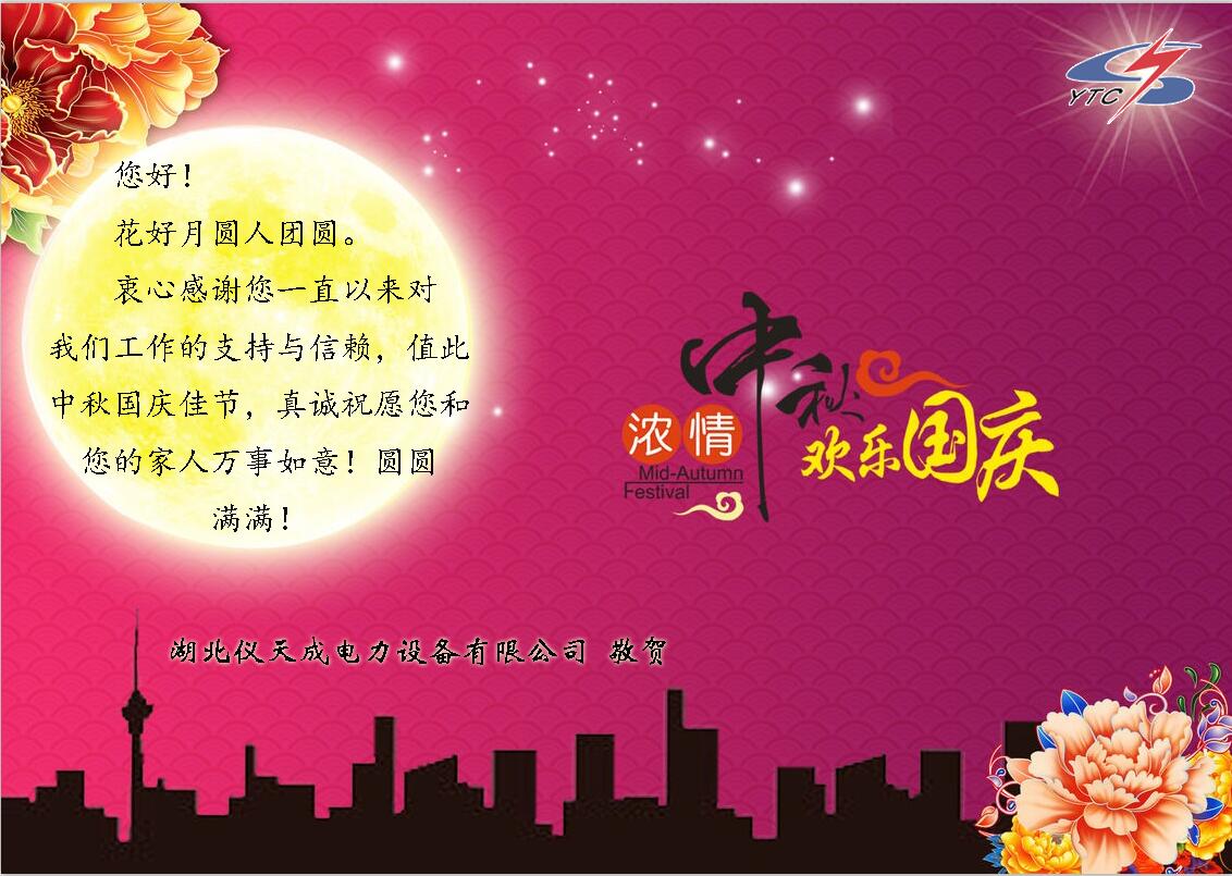 在這舉國歡慶的時刻,湖北儀天成電力設備有限公司衷心的祝愿祝所有的員工,所有的新老客戶,國慶節(jié)以及中秋節(jié)快樂!