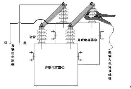 (4)將測試電壓電纜分別夾在被試電容器組兩極的連接母線上,鉗形電流取樣表卡在所需測量的單臺電容器的套管處;